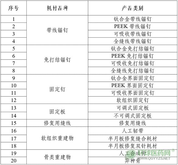 2.運動醫(yī)學類相關耗材:獲得中華人民共和國醫(yī)療器械注冊證的帶線錨釘、免打結錨釘、固定釘、固定板、修復用縫線、軟組織重建物、骨類重建物(不包括應用于顱頜面產品)。