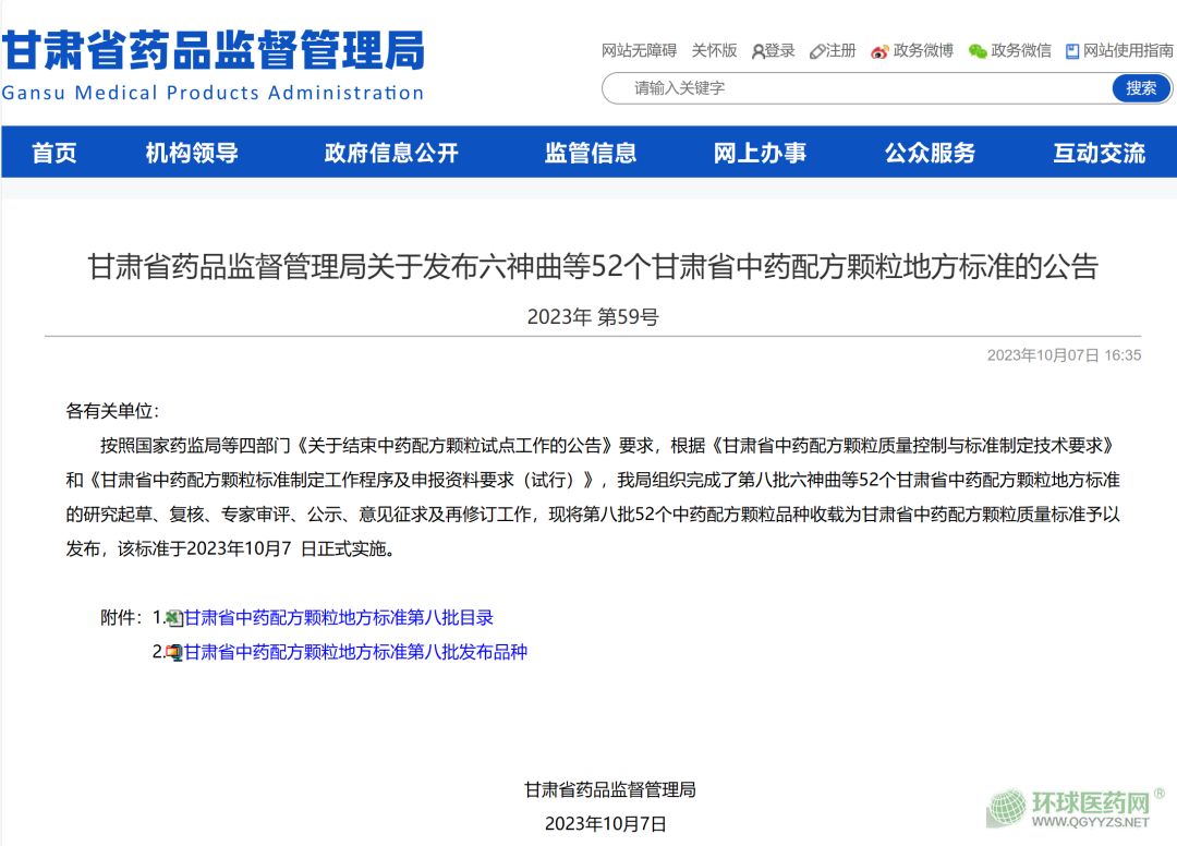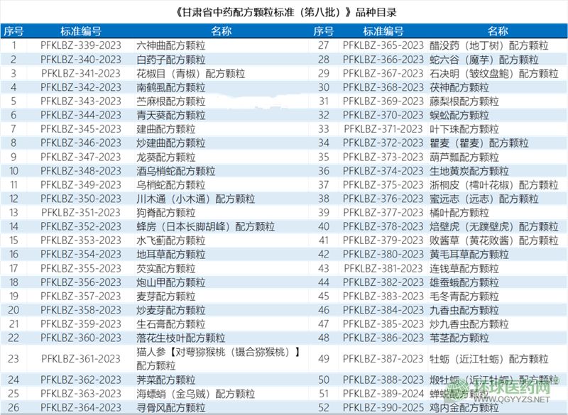 近日,甘肅省藥監(jiān)局發(fā)布公告,六神曲等52個(gè)甘肅省中藥配方顆粒地方標(biāo)準(zhǔn)(第八批)自發(fā)布之日起實(shí)施。