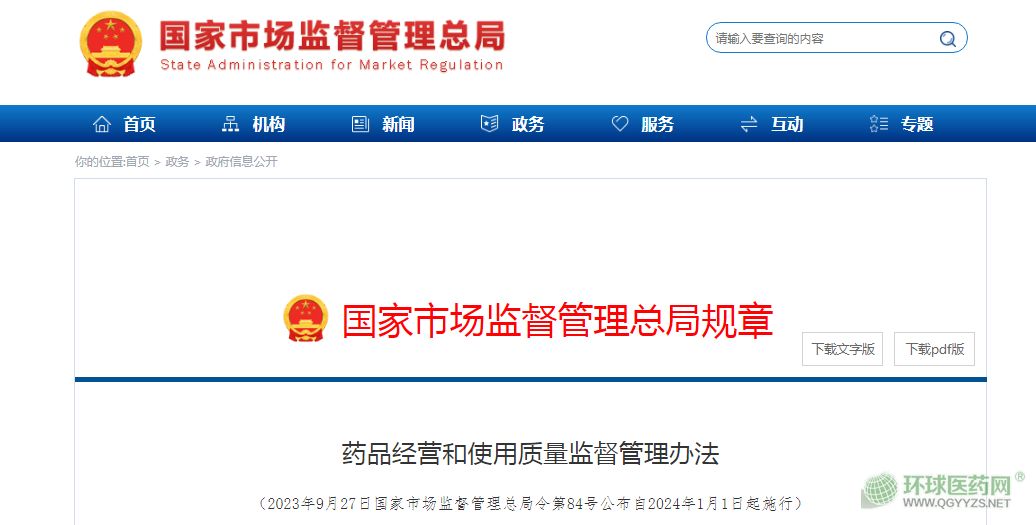 日前,國(guó)家市場(chǎng)監(jiān)督管理總局官網(wǎng)公布《藥品經(jīng)營(yíng)和使用質(zhì)量監(jiān)督管理辦法》(以下簡(jiǎn)稱《辦法》),自2024年1月1日起施行。