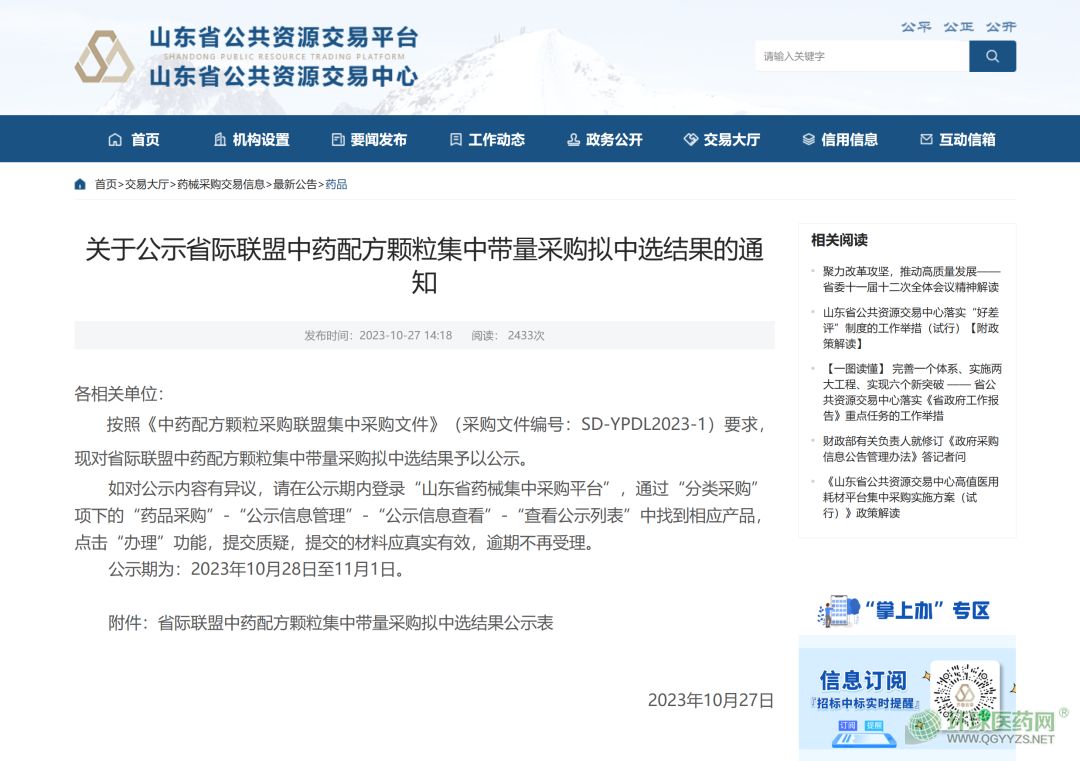 10月27日,山東省公共資源交易中心公示省際聯(lián)盟中藥配方顆粒集中帶量采購擬中選結(jié)果。