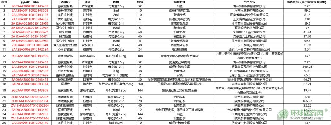 根據(jù)梳理,《通知》中共涉及19家藥企的26個(gè)品種,包括正大青春寶藥業(yè)有限公司的香丹注射液、安徽雷允上藥業(yè)有限公司的腦安膠囊、亞寶藥業(yè)集團(tuán)股份有限公司的冠心寧注射液等。