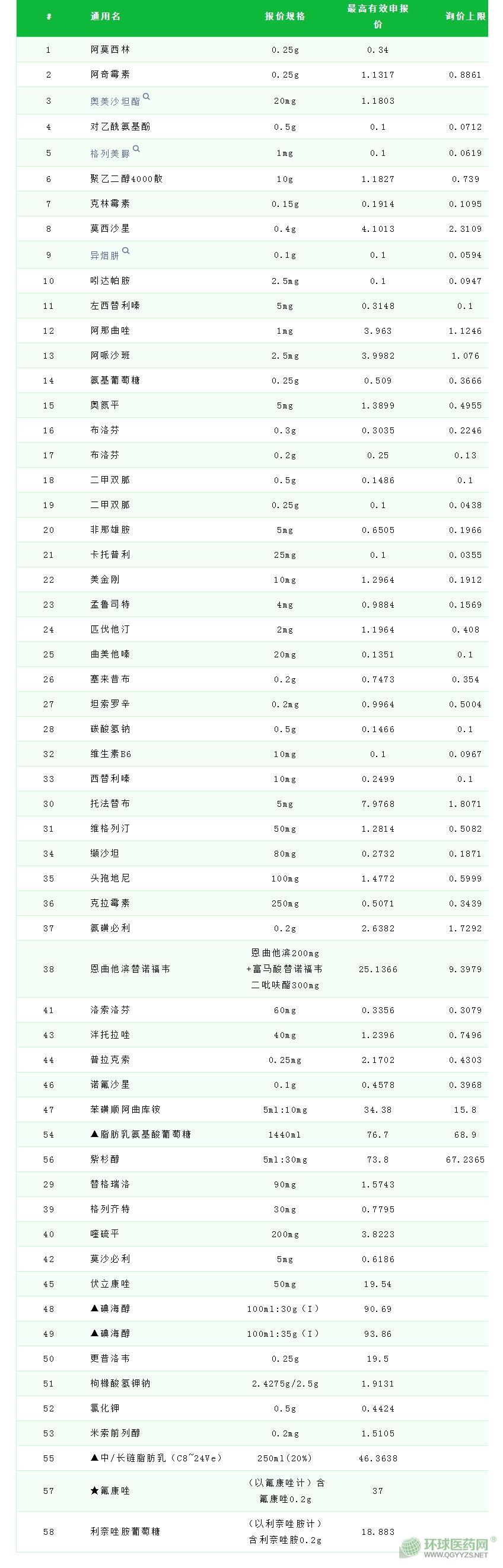 共有 58 個(gè)品種,簡要列舉具體如下(單位:元):