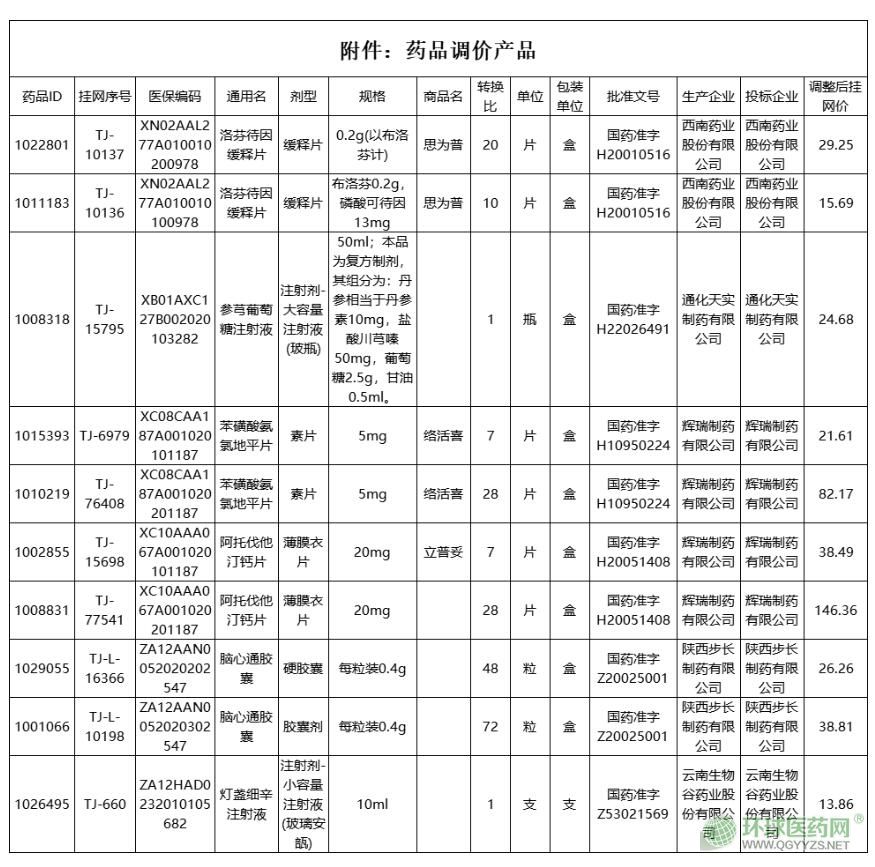 根據(jù)梳理,本次參與價格調(diào)整的產(chǎn)品合計10個,覆蓋洛芬待因緩釋片、苯磺酸氨氯地平片、阿托伐他汀鈣片、腦心通膠囊、參芎葡萄糖注射液和燈盞細辛注射液共6個品種,涉及輝瑞制藥有限公司、西南藥業(yè)股份有限公司、陜西步長制藥有限公司、通化天實制藥有限公司及云南生物谷藥業(yè)股份有限公司5家藥企。