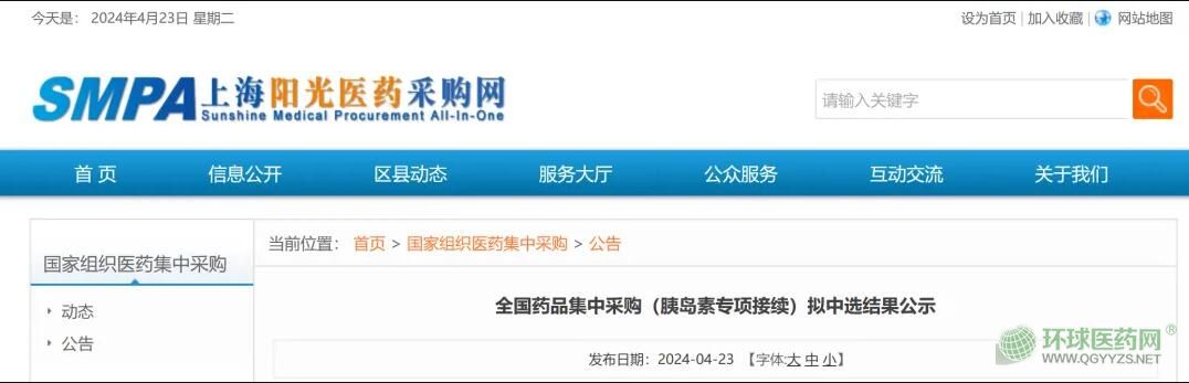 4月23日,據(jù)上海陽光醫(yī)藥采購網(wǎng)消息,國家胰島素集采續(xù)標(biāo)公布擬中選結(jié)果(公示時間:2024年4月24日至2024年4月26日)。