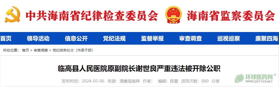 通報(bào)顯示,經(jīng)查,謝世良利用職務(wù)便利,在工程項(xiàng)目承攬、藥品采購等方面為他人謀取利益,并非法收受巨額財(cái)物。