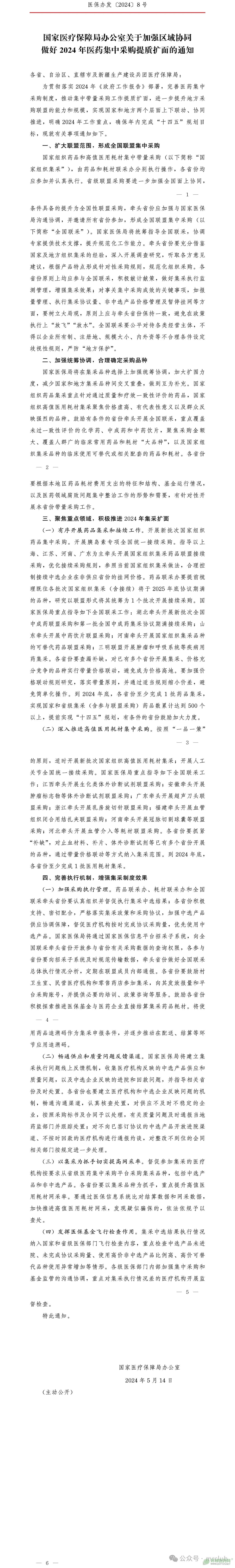 5 月 20 日,國家醫(yī)保局發(fā)布《國家醫(yī)療保障局辦公室關于加強區(qū)域協(xié)同做好2024年醫(yī)藥集中采購提質(zhì)擴面的通知》(醫(yī)保辦發(fā)〔2024〕8 號),對 2024 年集采工作重點做出明確,內(nèi)容顯示,2024 集采提質(zhì)擴面將再上一個臺階,進一步提升地方采購聯(lián)盟的能力和規(guī)模,實現(xiàn)國家和地方兩個層面上下聯(lián)動、協(xié)同推進。