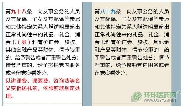 原第八十九條、現(xiàn)第九十八條規(guī)定“向從事公務(wù)的人員及其配偶、子女及其配偶等親屬和其他特定關(guān)系人贈送明顯超出正常禮尚往來的禮品、禮金、消費(fèi)卡(券)和有價(jià)證券、股權(quán)、其他金融產(chǎn)品等財(cái)物,情節(jié)較重的,給予警告或者嚴(yán)重警告處分;情節(jié)嚴(yán)重的,給予撤銷黨內(nèi)職務(wù)或者留黨察看處分”后,增加了“以講課費(fèi)、課題費(fèi)、咨詢費(fèi)等名義變相送禮的,依照前款規(guī)定處理”。