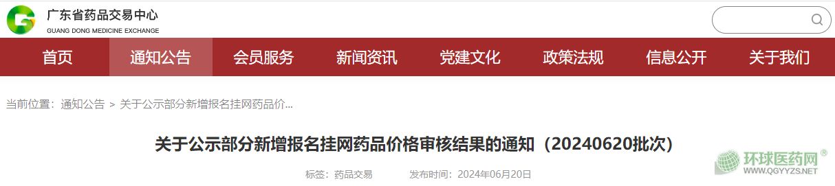 廣東省藥品交易中心發(fā)布《關(guān)于公示部分新增報名掛網(wǎng)藥品價格審核結(jié)果的通知(20240620批次)》(下稱《通知》),公示時間至2024年6月24日24:00。