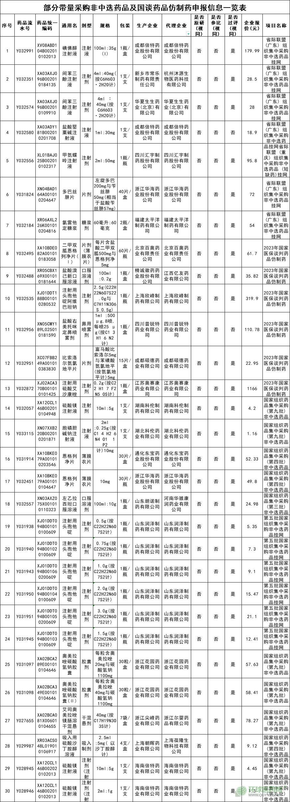 帶量采購非中選藥品及國談藥品仿制藥合計30個,涉及注射用頭孢他啶等21個品種和海南倍特藥業(yè)有限公司等21家生產企業(yè)、通化東寶藥業(yè)股份有限公司等21家代理企業(yè)(詳見附件1);