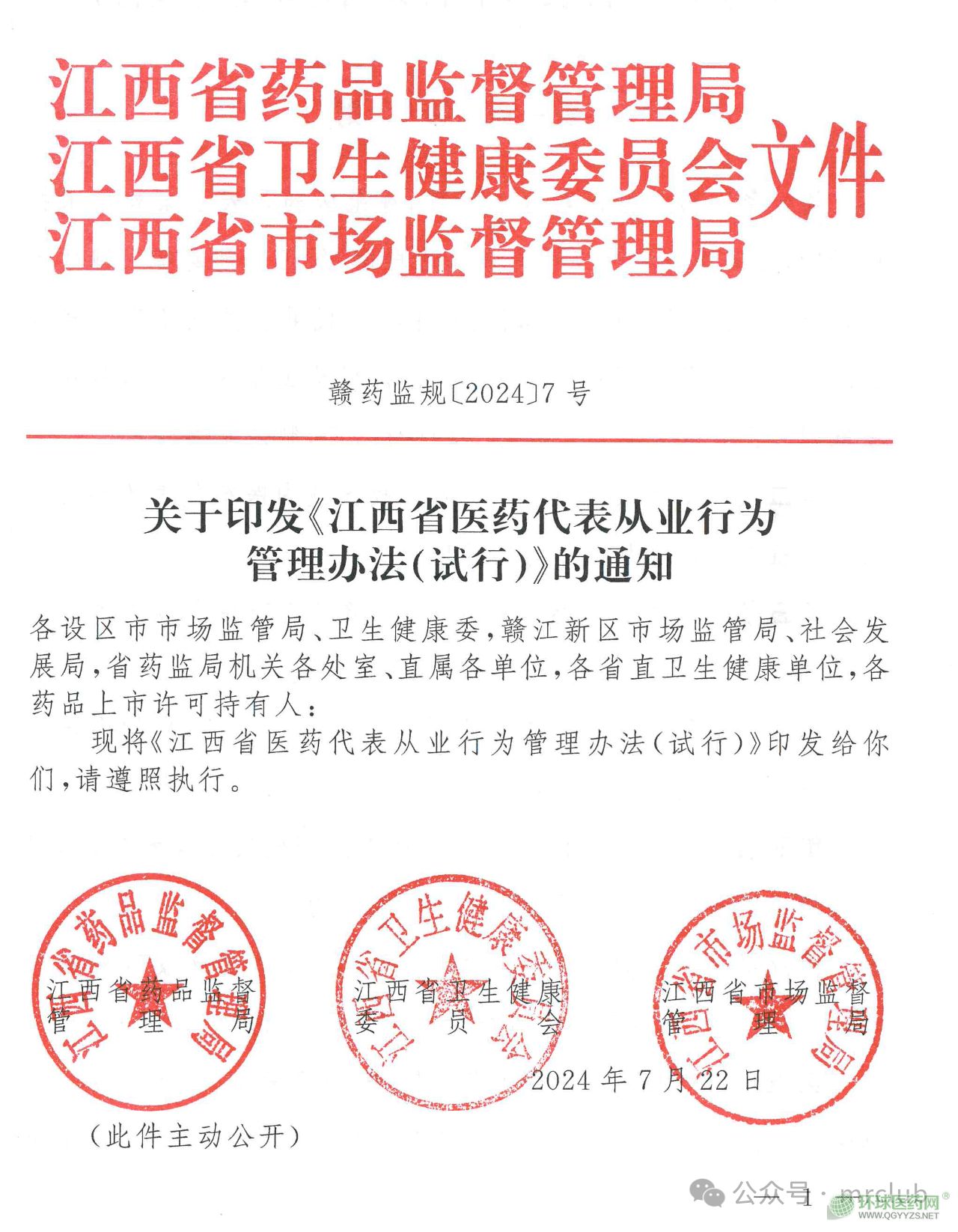 7月29 日,江西省藥監(jiān)局正式公布了本省醫(yī)藥代表管理文件——關(guān)于印發(fā)《江西省醫(yī)藥代表從業(yè)行為管理辦法(試行)》的通知,《通知》顯示,該《管理辦法》成文于 7 月 22 日,由江西省藥品監(jiān)督管理局、江西省衛(wèi)生健康委院會、江西省市場監(jiān)督管理局聯(lián)合印發(fā)。