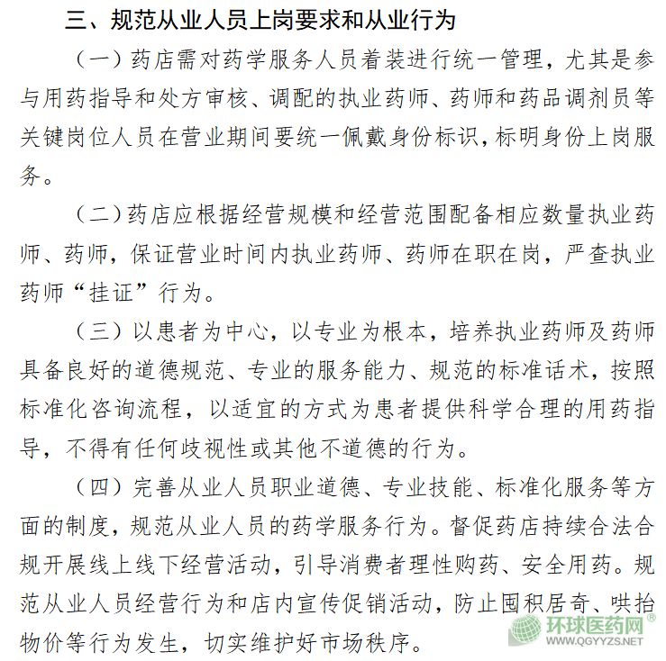 該文件明確,規(guī)范從業(yè)人員上崗要求和從業(yè)行為,尤其是包括執(zhí)業(yè)藥師在內(nèi)藥學(xué)服務(wù)專業(yè)人員,涉及著裝、身份標(biāo)識(shí)、人員配備、職業(yè)道德、標(biāo)準(zhǔn)化服務(wù)等。