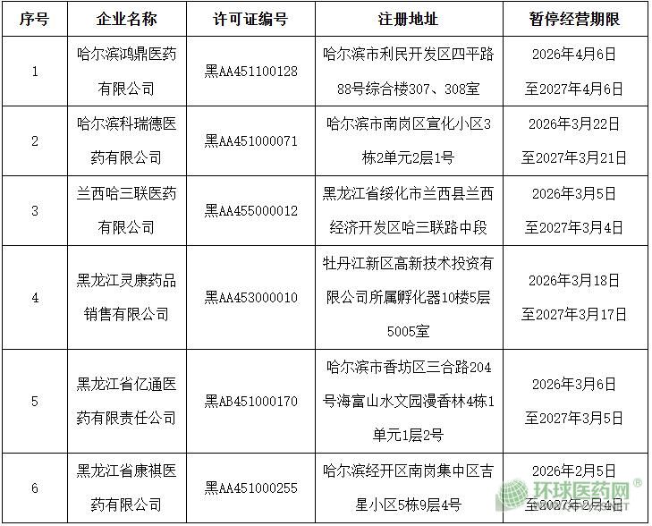 依據(jù)《黑龍江省藥品監(jiān)督管理局規(guī)范藥品經(jīng)營企業(yè)暫停經(jīng)營行為管理辦法(試行)》(黑藥監(jiān)規(guī)〔2023〕3號),現(xiàn)將申請暫停經(jīng)營的藥品企業(yè)信息通告如下: