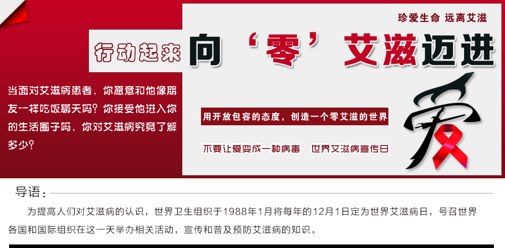 12月1日是一年一度的世界艾滋病日。在地球上,平均每分鐘都有一個(gè)孩子死?于艾滋病,有超過1500萬的兒童因?yàn)榘滩《ジ改?。中?guó)艾滋病病毒感染人數(shù)在全球居第十四位,更以每年百分之四十的速度遞增。防治艾滋病任重道遠(yuǎn),需要全社會(huì)共同努力。面對(duì)因艾滋釀成的一樁樁悲劇,我們不需要旁觀者,我們要用自己的力量來扭轉(zhuǎn)這場(chǎng)惡性流行病的傳播態(tài)勢(shì)——團(tuán)結(jié)全社會(huì)的力量,以我們所能做到的各種方式,共同抗擊艾滋! 12月1日是世界艾滋病日,這天旨在提高公眾對(duì)HⅣ病毒引起的艾滋病在全球傳播的意識(shí)。定為12月1日是因?yàn)榈谝粋€(gè)艾滋病病例是在1981年此日診斷出來的。從此,艾滋病已造成超過兩千五百萬人死亡。即使世界許多地區(qū)的治療管道已經(jīng)改善,2005年仍有310萬左右(280萬到360萬之間)人死于艾滋病,其中約有57萬人是兒童。