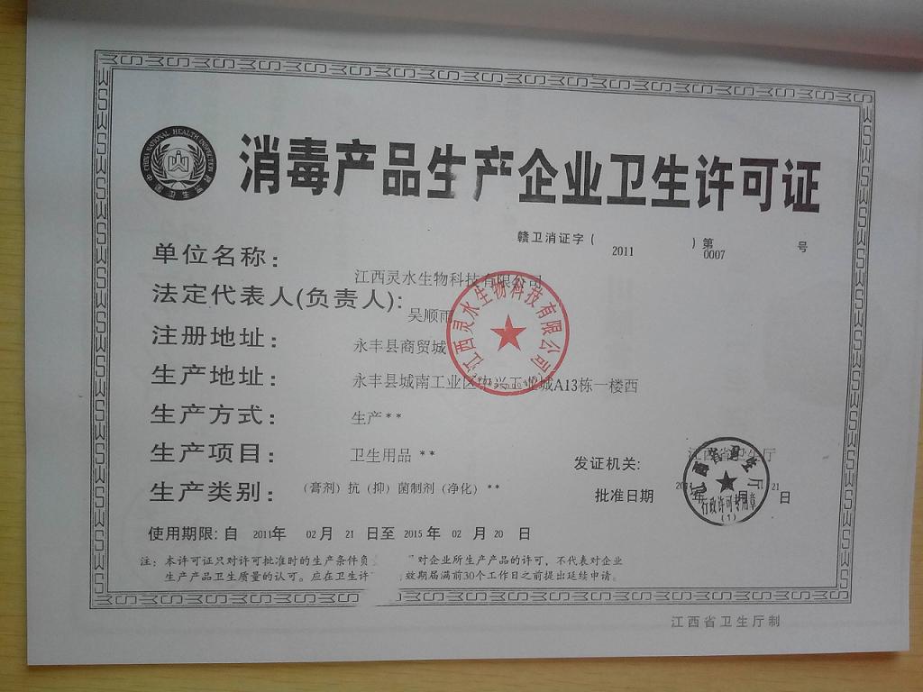 - 消毒產(chǎn)品生產(chǎn)企業(yè)衛(wèi)生許可證