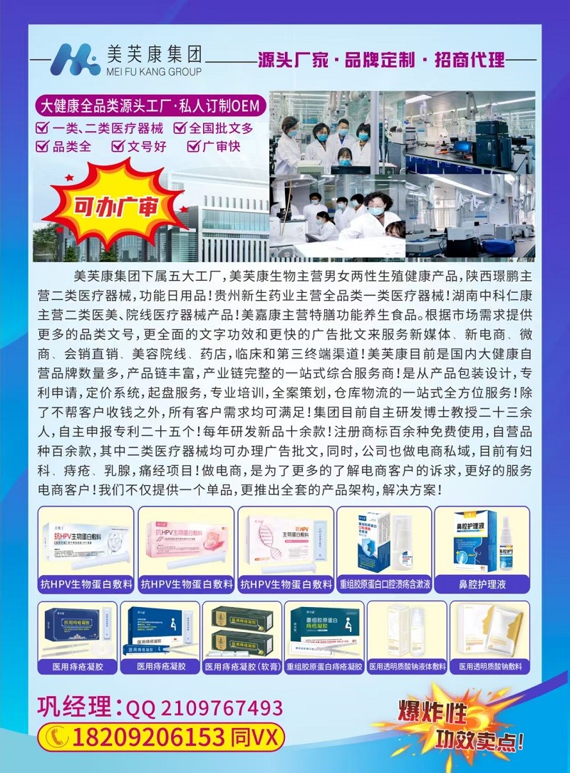 核心產(chǎn)品包括抗HPV生物蛋白輔料等,針對HPV感染預防、婦科炎癥輔助治療等剛需場景,憑借溫和配方與明確功效,成為藥店、美容院線、私域社群的走量品類;可辦理廣告批文,適配新媒體、電商等渠道推廣。