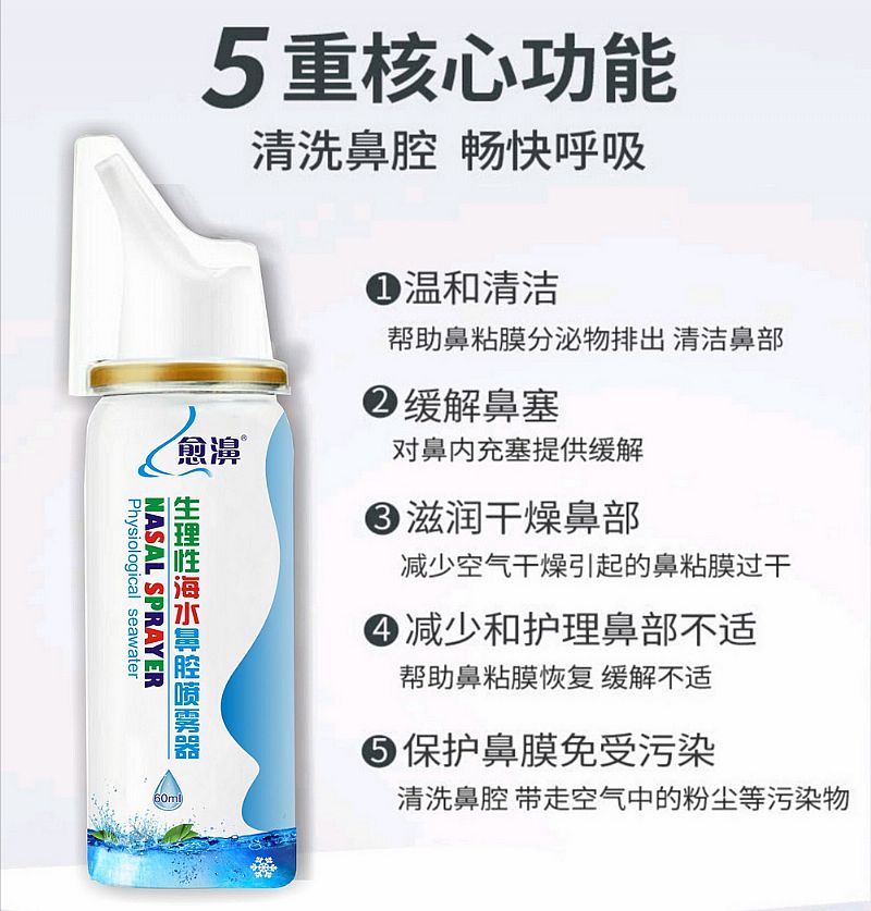 作用機理:生理性海水鼻腔噴霧器清潔鼻腔的方法是通過定量微噴系統(tǒng),把生理性海水送至鼻腔深處,稀釋黏膜表面各類膿性分泌物,使患者更易將分泌物排出體外,清潔鼻腔,保持鼻腔濕潤。建議每天2-6次。