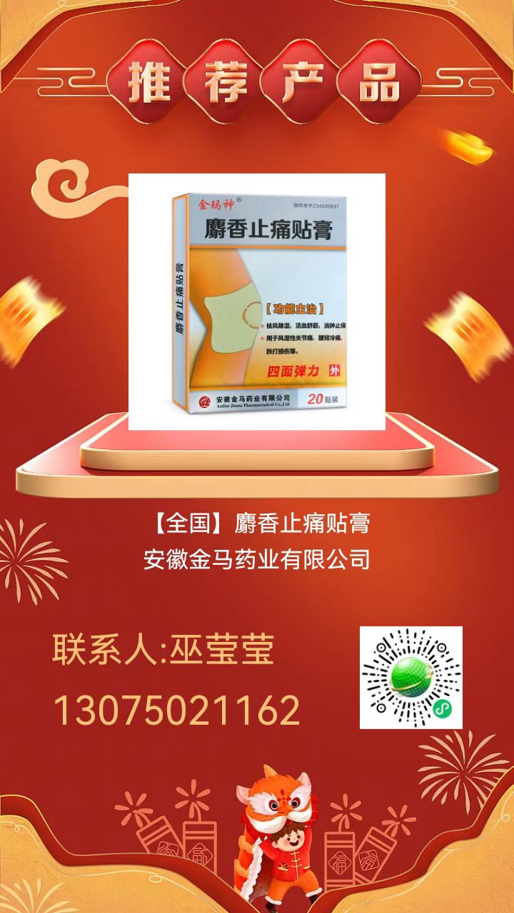 麝香止痛貼膏為安徽金馬藥業(yè)有限公司的控銷產(chǎn)品,正在環(huán)球醫(yī)藥網(wǎng)火爆招商中,歡迎前來(lái)聯(lián)系洽談。