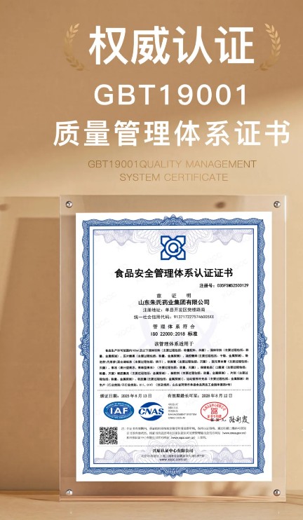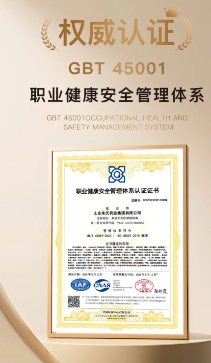 山東朱氏藥業(yè)集團(tuán)憑借多項(xiàng)國際國內(nèi)權(quán)威認(rèn)證,在質(zhì)量管理、職業(yè)健康、食品**、環(huán)境保護(hù)四大維度達(dá)到行業(yè)先進(jìn)水平,以“標(biāo)準(zhǔn)筑牢品質(zhì),體系守護(hù)健康”的理念彰顯非凡企業(yè)實(shí)力。