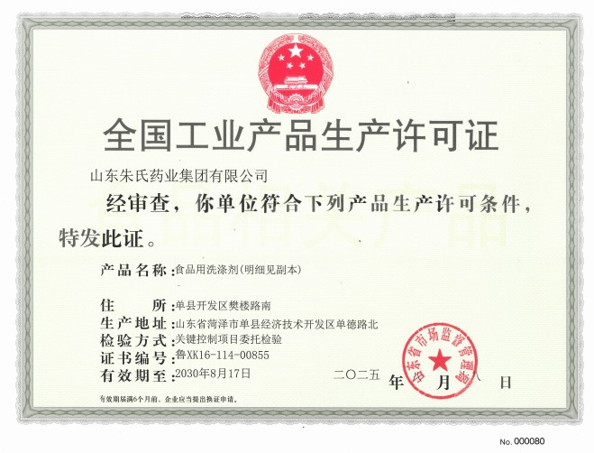 喜訊!山東朱氏藥業(yè)集團(tuán)獲食品用洗滌劑生產(chǎn)許可證!