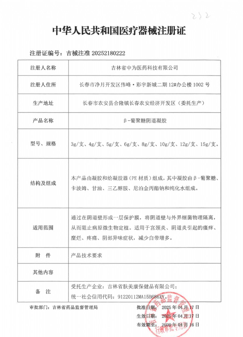 新證落地!山東皇圣堂藥業(yè)有限公司拿下β-葡聚糖陰道凝膠醫(yī)療器械注冊證
