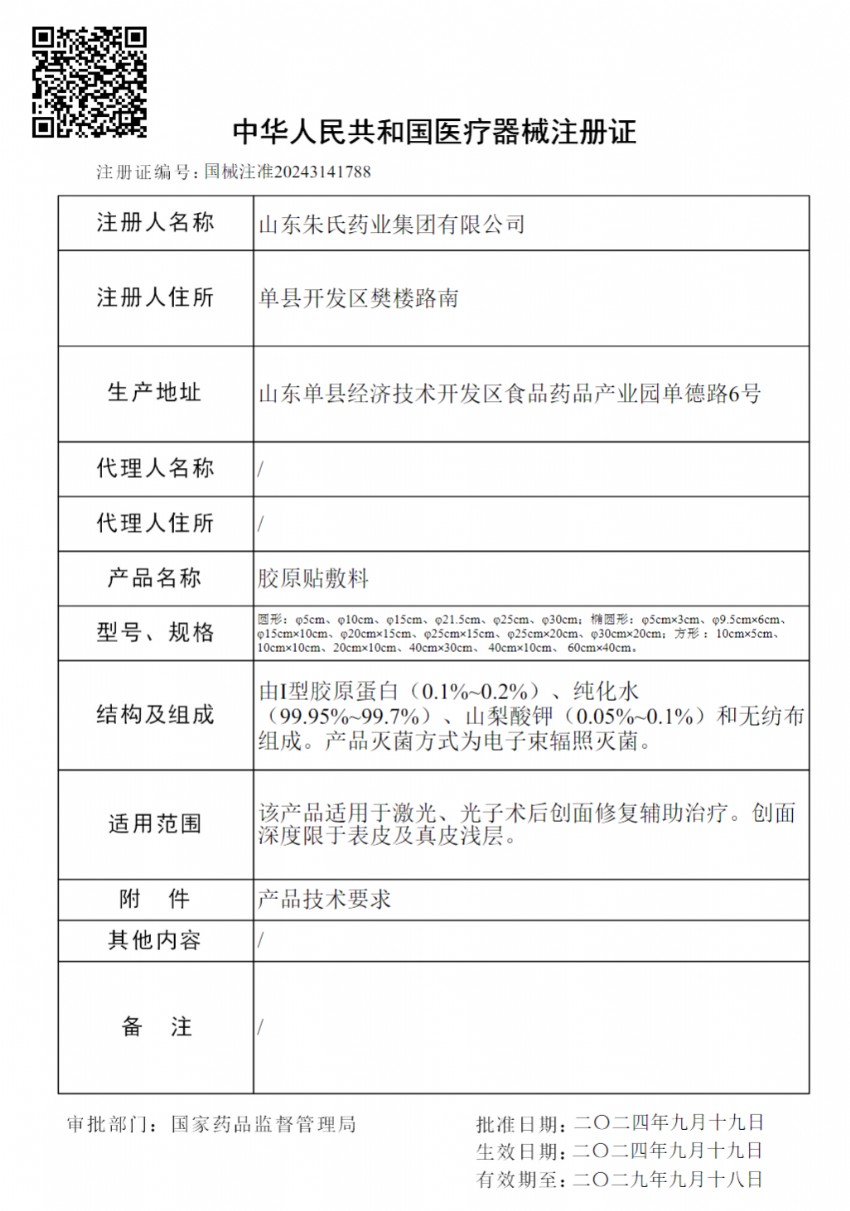 山東皇圣堂藥業(yè)有限公司實(shí)力認(rèn)證:醫(yī)用膠原貼敷料成功取得醫(yī)用遠(yuǎn)紅外治療貼醫(yī)療器械注冊證