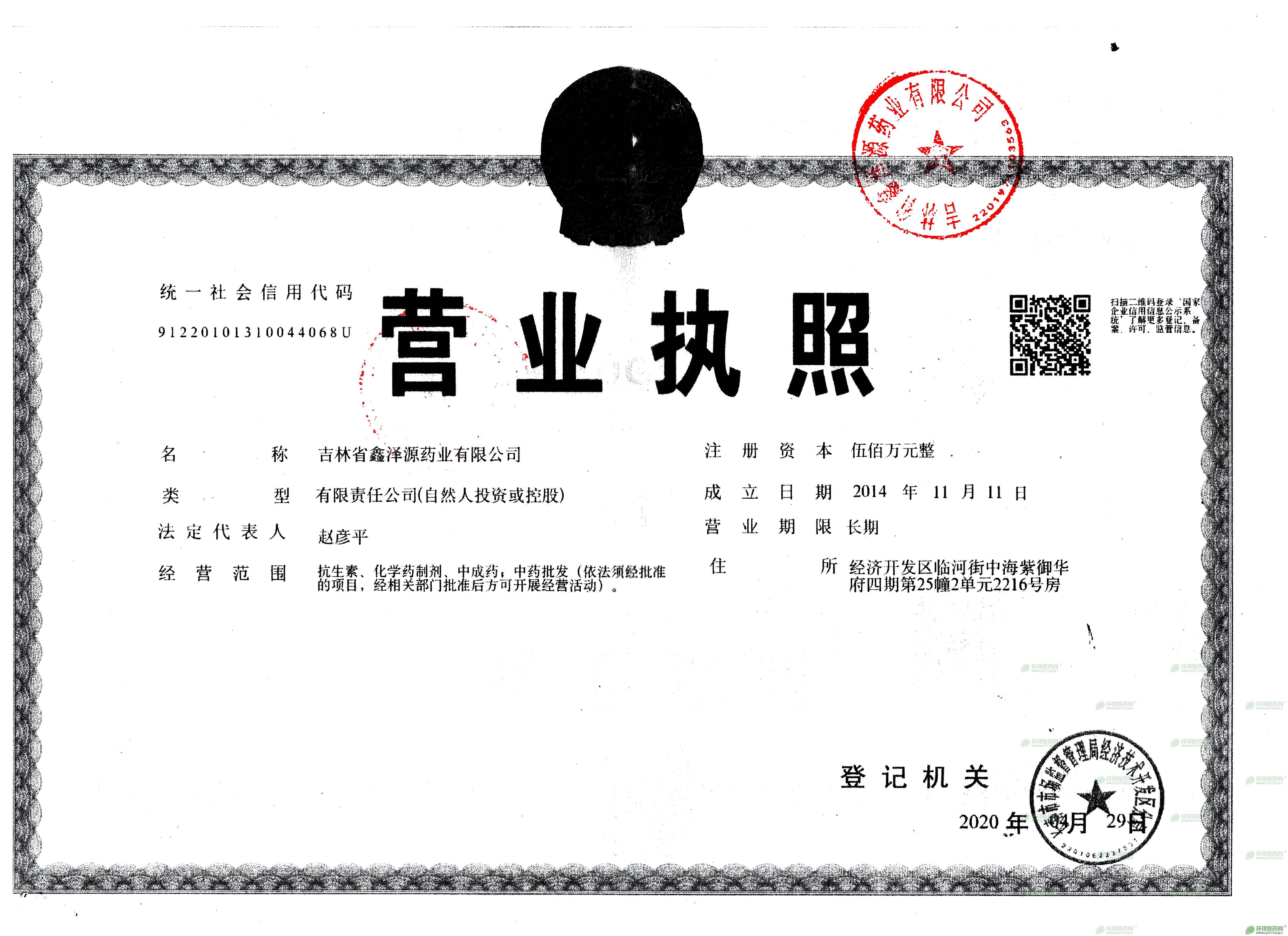 [企業(yè)法人]:吉林省鑫澤源藥業(yè)有限公司