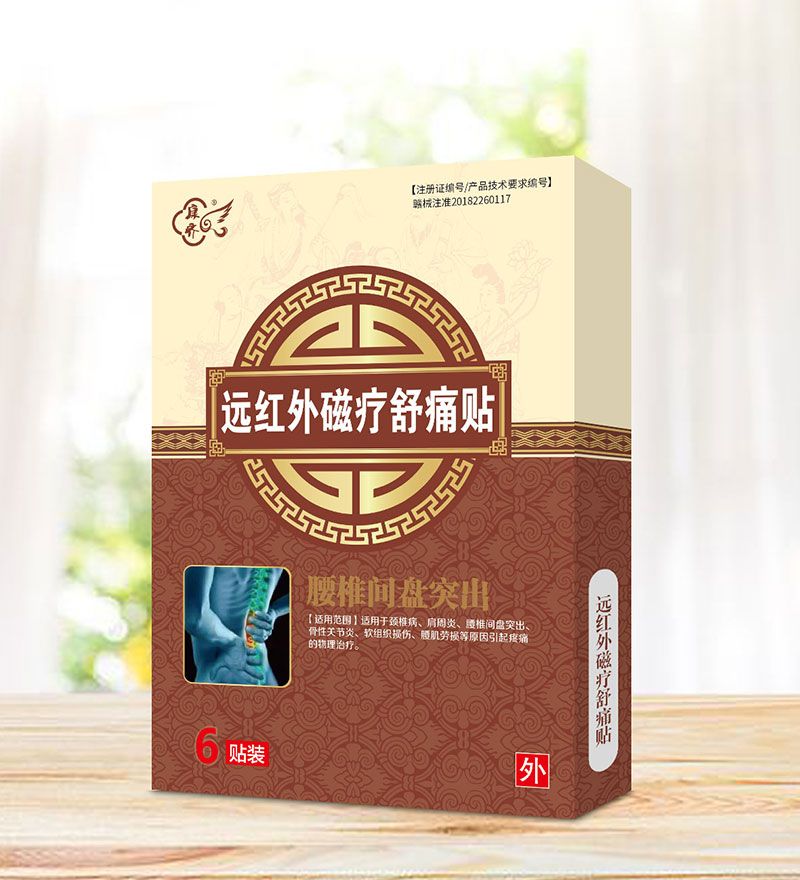 - 腰間盤突出遠(yuǎn)紅外磁療舒痛貼 批準(zhǔn)文號(hào): 贛械注準(zhǔn)20182260117規(guī) 格: 9cm* 12cm/貼*6貼/盒