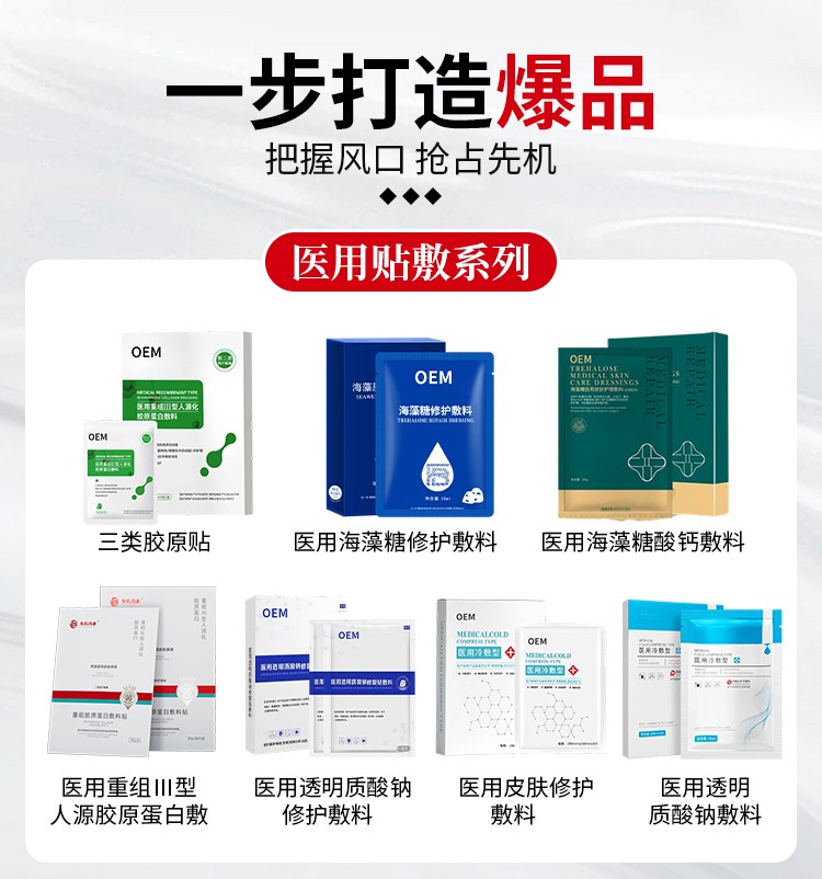 一、科學配方定制:以功效為核心,精準匹配應用場景山東皇圣堂藥業(yè)有限公司擁有獨立研發(fā)實驗室與百人技術(shù)團隊,可根據(jù)品牌定位和目標人群,定制具有明確修復功效的配方方案:術(shù)后修復類:采用高純度透明質(zhì)酸鈉、重組膠原蛋白、積雪草提取物等成分,優(yōu)化基質(zhì)滲透性,加速皮膚屏障重建;敏感肌護理類:通過低溫萃取工藝保留植物活性,減少刺激源,提升舒緩效果;專利技術(shù)支持:應用微針透皮、納米緩釋等專利工藝,增強成分吸收率與產(chǎn)品穩(wěn)定性 。**配方均需通過細胞毒性試驗、皮膚刺激性試驗等**性驗證,確保臨床使用**可靠 。二、多劑型靈活開發(fā):滿足不同護理場景需求支持多種劑型的個性化開發(fā),適配醫(yī)美機構(gòu)多樣化操作流程:貼膜類(水凝膠、無紡布、生物纖維)凝膠/乳液類(冷敷凝膠、修復精華)噴霧/敷料類(即用型噴霧、無菌紗布浸液)企業(yè)采用模塊化生產(chǎn)線,可快速切換不同劑型與規(guī)格,支持小批量試產(chǎn)(低至5000片起訂),降低品牌試錯成本 。