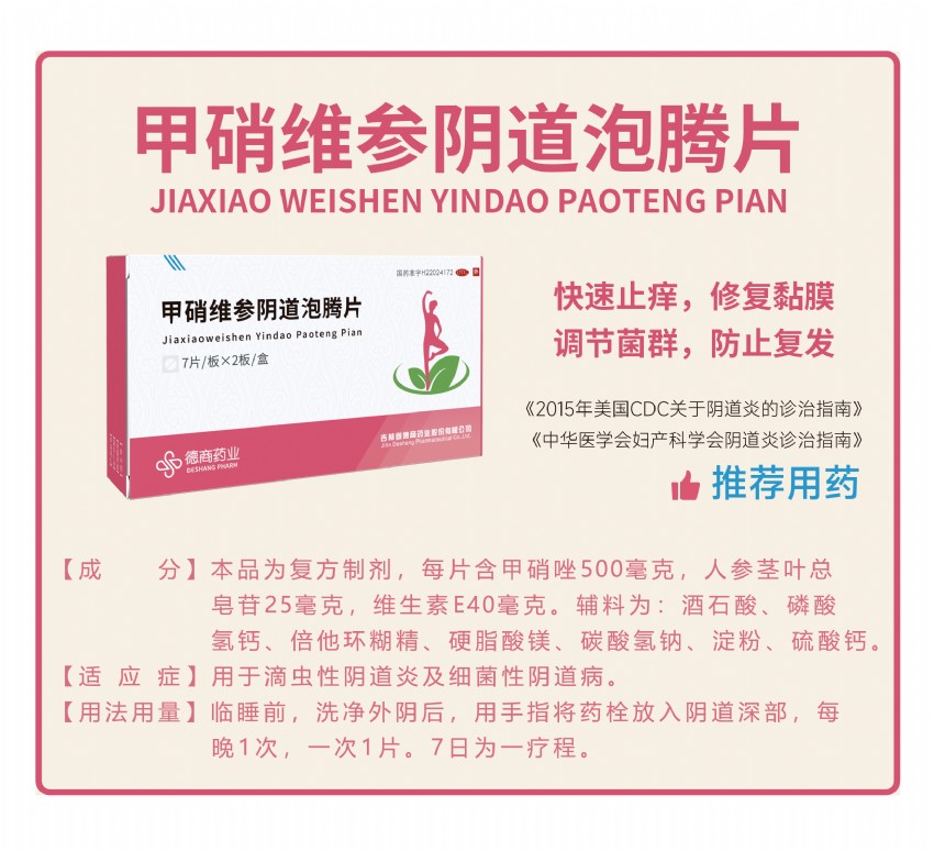 1. 甲硝唑:細菌性、滴蟲性陰道炎指南推薦用藥,可以有效殺滅病原體。
