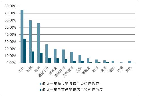 兒童患病率較高的疾病主要是呼吸系統(tǒng)疾病和消化系統(tǒng)疾病。統(tǒng)計(jì)數(shù)據(jù)顯示,2016年我國(guó)0-14歲兒童患者群體中,兒童有進(jìn)行藥物治療的疾病患病率前五名分別為感冒(74.7%)、發(fā)燒(59.8%)、咳嗽(56.0%)、消化不良(26.1%)和腸胃炎(19.9%)。