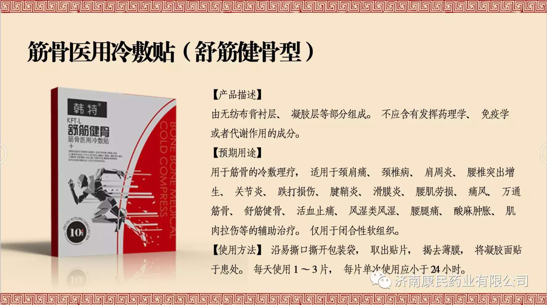 上述有提到舒筋健骨型醫(yī)用冷敷貼,這款產品是我們山東朱氏藥業(yè)集團有限公司生產的,這款產品 透皮綠色療法,以理法方藥為依據(jù),通過載體貼敷在相應的穴位上,在藥物和載體的雙重作用下; 優(yōu)點是可以不經消化道。