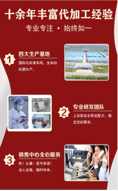 客戶提供原材料、包材,我方提供設(shè)備、相關(guān)資質(zhì)、生產(chǎn)場(chǎng)地、人員根據(jù)客戶要求進(jìn)行加工生產(chǎn)。