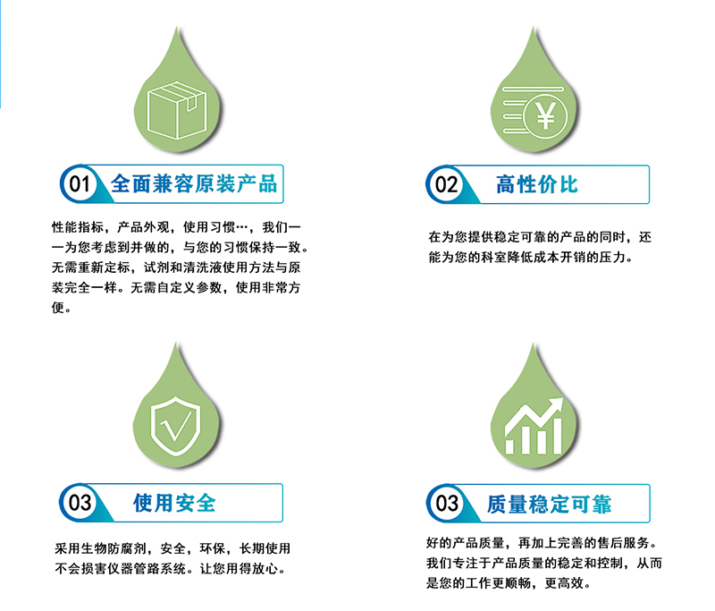 1、**兼容原裝產(chǎn)品:性能指標,產(chǎn)品外觀,使用習慣,我們一一為您考慮到并做的,與您的習慣保持一致 。無需重新定標,試劑和清洗液使用方法與原裝完全一樣。無需自定義參數(shù),使用非常方便。