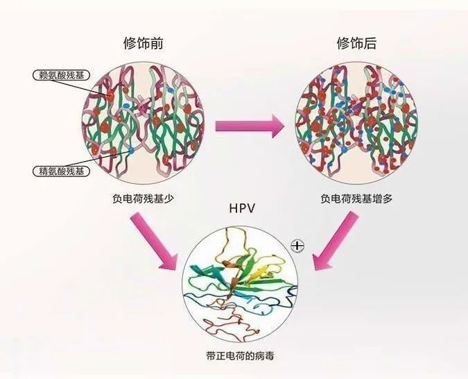 生物蛋白來源于牛奶中的乳鐵蛋白,而該蛋白上含有690多個殘基。未經(jīng)修飾的乳鐵蛋白即可感染部分病毒與宿主細胞的結(jié)合,并且抑制其感染性炎癥的發(fā)生,通過科技手段進行酸酐化生物蛋白為酸酐修飾的蛋白,使其有著極高的修飾率。經(jīng)過修飾獲得的生物蛋白表面滿載負電荷,與HPV病毒相結(jié)合,表現(xiàn)出優(yōu)秀的活性。