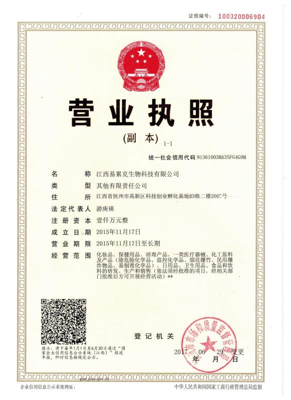 易累克生物科技有限公司總部位于上海,子公司江西易累克生物科技有限公司坐落于撫州高新技術(shù)產(chǎn)業(yè)開發(fā)區(qū),屬于高新區(qū)重點(diǎn)支持企業(yè)。公司集滬贛兩地智慧共謀創(chuàng)新科技,的研發(fā)團(tuán)隊(duì)配備專業(yè)的科研實(shí)驗(yàn)室,歷經(jīng)長時(shí)間潛心研發(fā),致力于保健類化妝品領(lǐng)域產(chǎn)品的研發(fā)、生產(chǎn)及銷售,注冊資本1000萬。公司主要從事保健用品、衛(wèi)生用品、消毒產(chǎn)品、一類醫(yī)療器械、日用品、食品和飲料、化妝品的研發(fā)、生產(chǎn)和銷售。旗下“疏經(jīng)活絡(luò),活血止痛通博士系列;提神醒腦,疏通鼻塞醒博士系列;緩解疲勞,保護(hù)視力好視珍明系列!