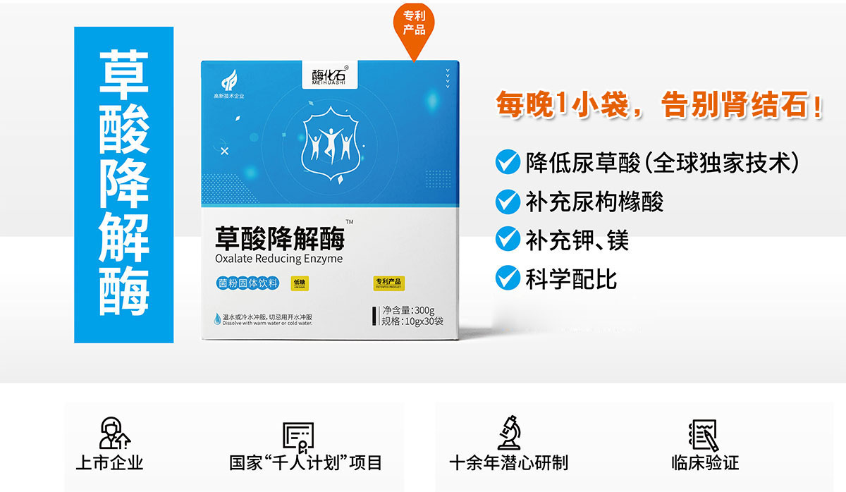 泌尿系結(jié)石-草酸降解酶獨(dú)家專利產(chǎn)品全國火熱招商中! 20個(gè)人里就有一個(gè)腎結(jié)石,其中80%是草酸鈣結(jié)石。20%患者每1-2年復(fù)發(fā)一次,發(fā)病率還在逐年增長。 為響應(yīng)國家號(hào)召,國家“千人計(jì)劃”專家李青山博士,回國創(chuàng)辦康復(fù)得生物科技股份有限公司,帶來了腎結(jié)石防治領(lǐng)域核心技術(shù),成功研發(fā)出【酶化石】草酸降解酶,開創(chuàng)