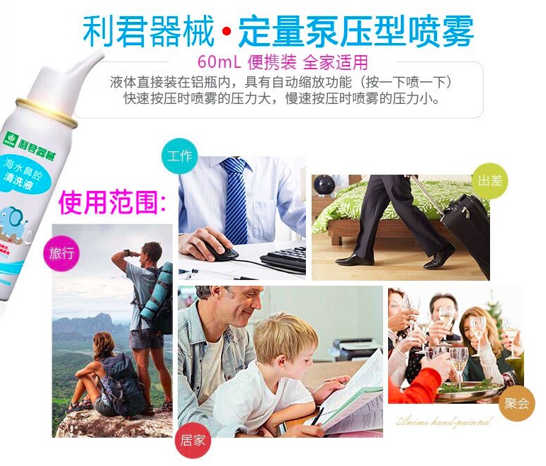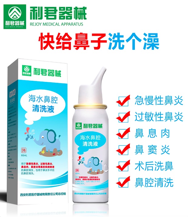 海水鼻腔清洗液由噴霧瓶和噴霧溶液{純化水和海水組成,海水由(純化水+海鹽溶解制成)構(gòu)成?捎糜诩甭员茄、過敏性鼻炎、鼻息肉、鼻竇炎等鼻腔疾病患者的鼻腔清洗,也用于鼻炎手術(shù)后的鼻腔清洗。