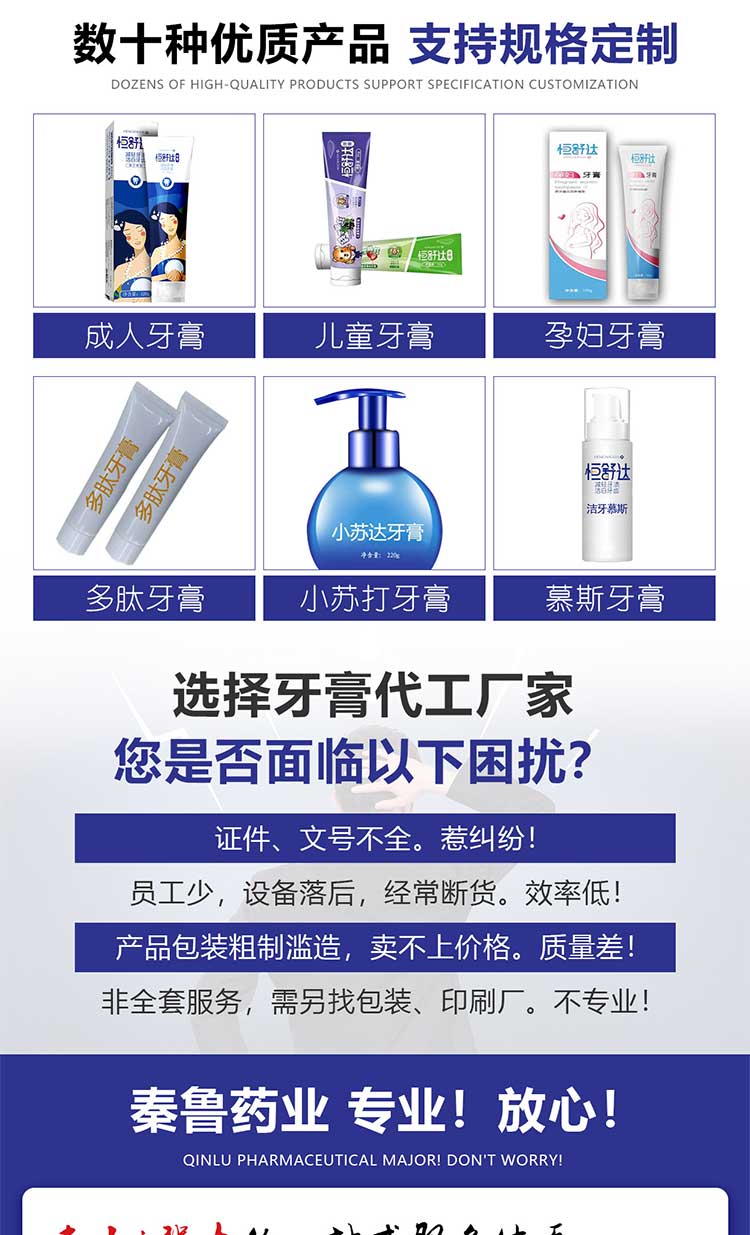 山東牙膏oem代加工廠家的優(yōu)勢細(xì)心考察會發(fā)現(xiàn)仍是有許多的,比如山東秦魯牙膏生產(chǎn)廠家二十年產(chǎn)品生產(chǎn)加工經(jīng)驗(yàn),而且產(chǎn)品二十年來不斷的暢銷國內(nèi)外,而且在資質(zhì)上具有產(chǎn)品消殺類、妝字號、械字號等多種生產(chǎn)文號,還有國家同意正規(guī)的生產(chǎn)證件,還在企業(yè)信息查詢網(wǎng)有存案隨時(shí)可接受查看,而在生產(chǎn)上秦魯選用進(jìn)口全自動灌裝機(jī),進(jìn)行24小時(shí)分割生產(chǎn)線流水作業(yè),日產(chǎn)量高達(dá)百萬支,在產(chǎn)品研發(fā)生產(chǎn)過程中有專業(yè)的生產(chǎn)團(tuán)隊(duì)進(jìn)行產(chǎn)品全程把控確保產(chǎn)品質(zhì)量,還在產(chǎn)品規(guī)劃到發(fā)貨安排專業(yè)人員全程跟進(jìn)確保貨源,規(guī)劃出貨24小時(shí)快速發(fā)貨,產(chǎn)品在廠家內(nèi)部接受五道質(zhì)量檢驗(yàn)更為產(chǎn)品質(zhì)量加了一份**。在合作方法上山東秦魯牙膏廠家支持客戶來料/來圖/來方/來樣/半制品/制品一站式加工生產(chǎn)。