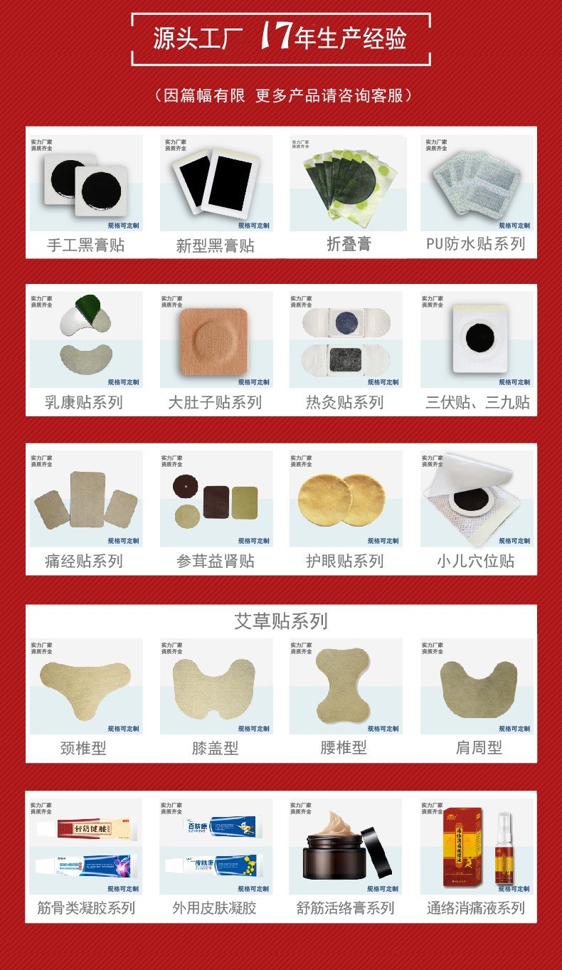 [主營產(chǎn)品]:貼膏、 化妝品、 牙膏牙刷、 黑膏貼、 暖宮貼、 三伏貼、 面膜、 巴布劑、 足貼、 婦科凝膠、 穴 更多>