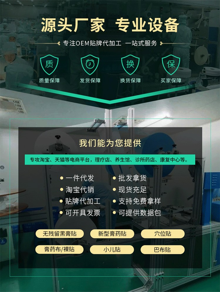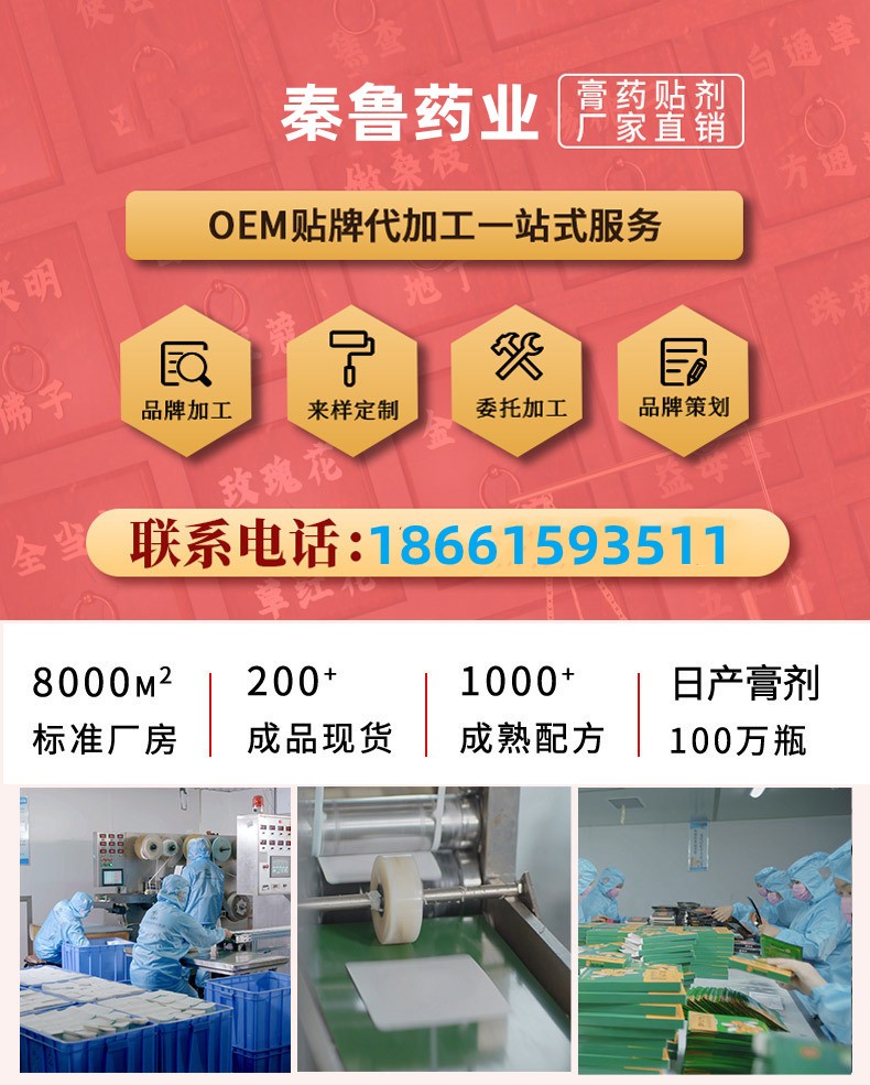 個(gè)性化定制:提供膏藥劑型規(guī)格尺寸設(shè)計(jì)定制、生產(chǎn)量以及包材個(gè)性定制等服務(wù),打造銷售公司個(gè)人專屬品牌乳腺貼產(chǎn)品。附加服務(wù)完善:提供原料代理采購、產(chǎn)品送檢、包材設(shè)計(jì)印刷等代加工項(xiàng)目附加服務(wù),讓客戶省心省力。專業(yè)配方支持:擁有現(xiàn)成的膏藥配方可供選擇,也可按照客戶需求進(jìn)行專屬配方設(shè)計(jì),并根據(jù)需求進(jìn)行整改,直至客戶滿意。