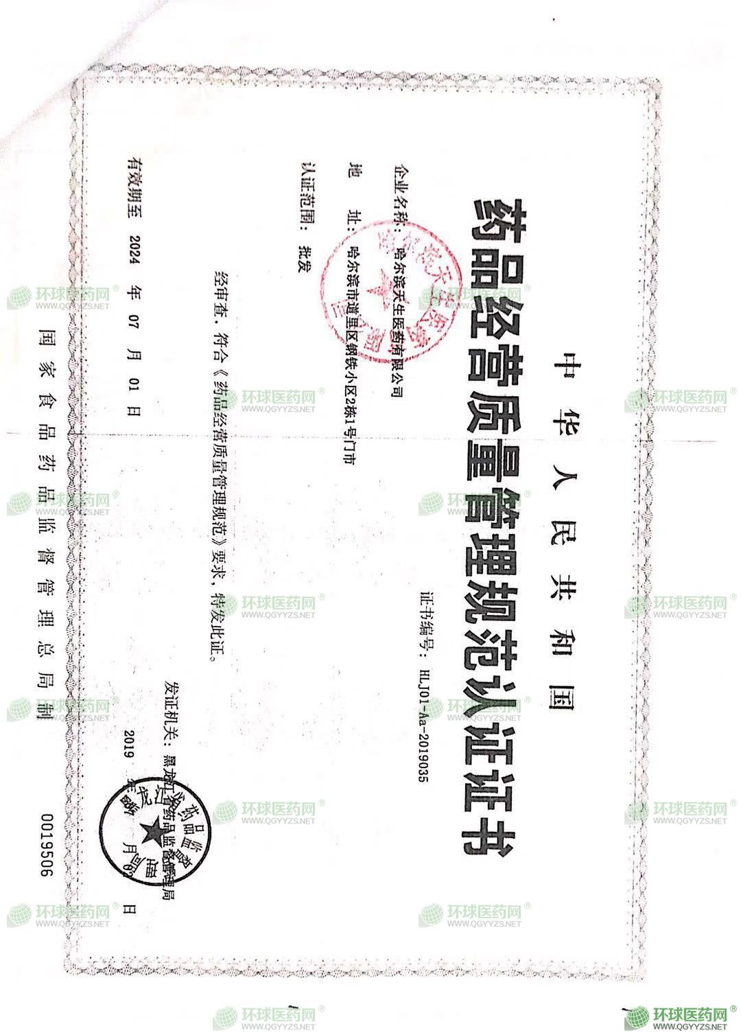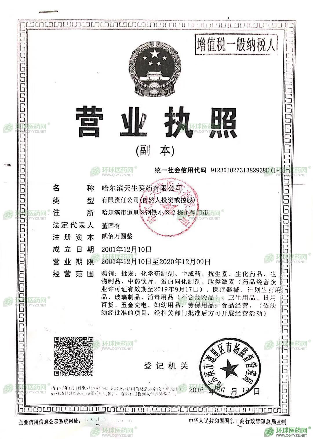 哈爾濱天生醫(yī)藥有限公司成立于2001年12月10日,注冊地位于哈爾濱市道里區(qū)鋼鐵小區(qū)2棟1號門市,法人代表為董國有。經(jīng)營范圍包括購銷:批發(fā):化學(xué)藥制劑、中成藥、抗生素、生化藥品、生物制品、中藥飲片、蛋白同化制劑、肽類激素(藥品經(jīng)營企業(yè)許可證有效期至2019年9月17日)、醫(yī)療器械、計(jì)劃生育用品、玻璃制品、消毒用品(不含危險品)、衛(wèi)生用品、日用百貨、五金交電、婦幼用品、勞保用品;食品經(jīng)營。