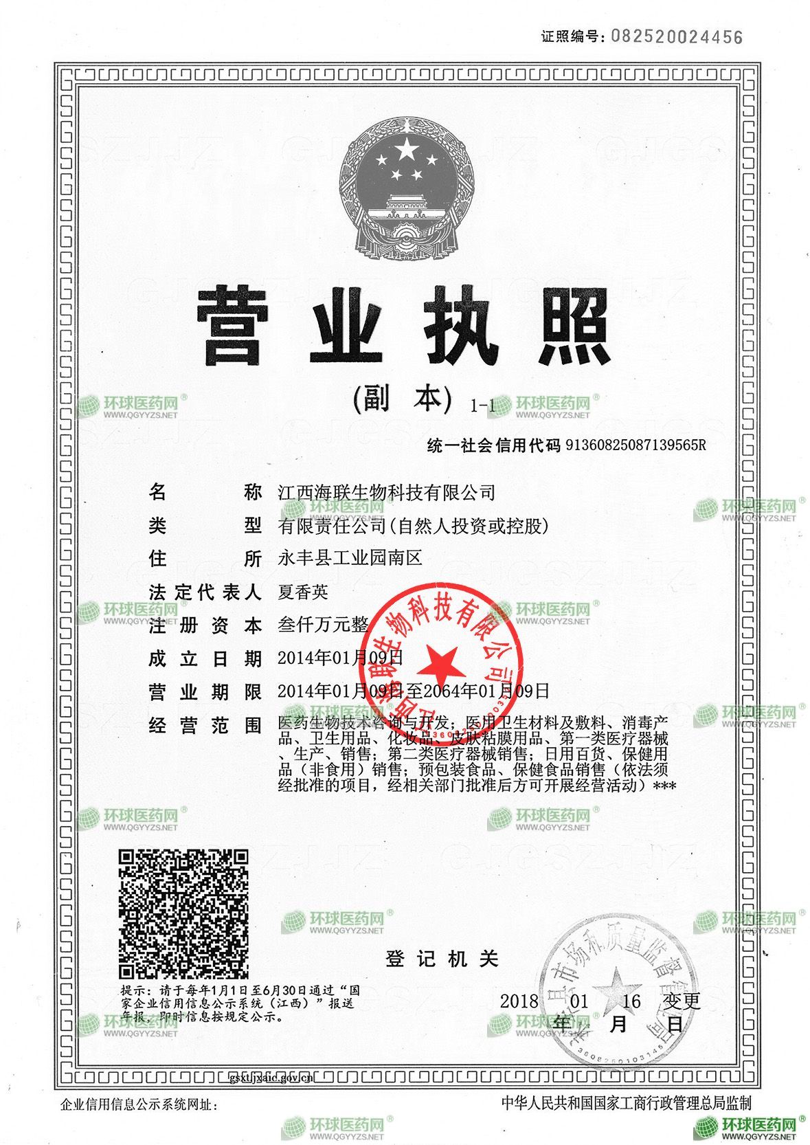 江西海聯(lián)生物科技有限公司于2014年01月09日,注冊地位于永豐縣工業(yè)園南區(qū),法人代表為夏香英。經(jīng)營范圍包括醫(yī)藥生物技術(shù)咨詢與開發(fā);醫(yī)用衛(wèi)生材料及敷料、消毒產(chǎn)品、衛(wèi)生用品、化妝品、皮膚粘膜用品、**類醫(yī)療器械、生產(chǎn)、銷售;第二類醫(yī)療器械銷售;日用百貨、保健用品(非食用)銷售;預(yù)包裝食品、保健食品銷售(依法須經(jīng)批準(zhǔn)的項目,經(jīng)相關(guān)部門批準(zhǔn)后方可開展經(jīng)營活動)