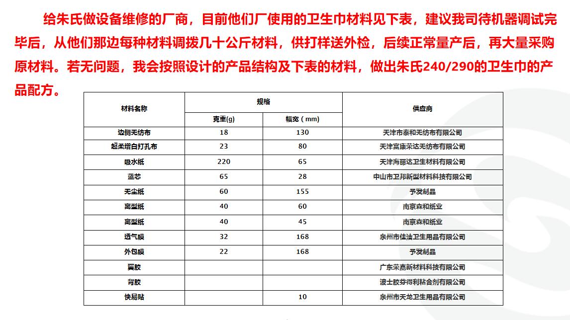 給朱氏做設(shè)備維修的廠商,目前他們廠使用的衛(wèi)生巾材料見下表,建議我司待機器調(diào)試完畢后,從他們那邊每種材料調(diào)撥幾十公斤材料,供打樣送外檢,后續(xù)正常量產(chǎn)后,再大量采購原材料。若無問題,我會按照設(shè)計的產(chǎn)品結(jié)構(gòu)及下表的材料,做出朱氏240/290的衛(wèi)生巾的產(chǎn)品配方。