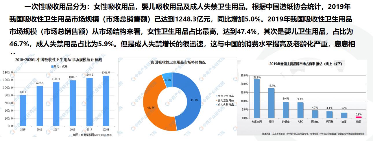 一次性吸收用品分為:女性吸收用品,嬰兒吸收用品及成人失禁衛(wèi)生用品。根據(jù)中國造紙協(xié)會統(tǒng)計,2019年我國吸收性衛(wèi)生用品市場規(guī)模(市場總銷售額)已達到1248.3億元,同比增加5.0%。2019年我國吸收性衛(wèi)生用品市場規(guī)模(市場總銷售額)從市場結(jié)構(gòu)來看,女性衛(wèi)生用品占比*高,達到47.4%,其次是嬰兒衛(wèi)生用品,占比為46.7%,成人失禁用品占比為5.9%。但是成人失禁增長的很迅速,這與中國的消費水平提高及老齡化嚴(yán)重,息息相關(guān)。