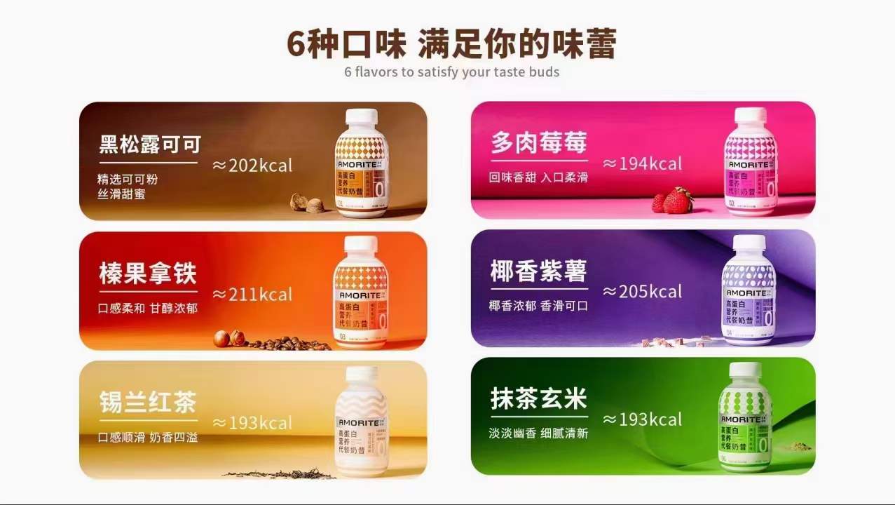 ①高蛋白營(yíng)養(yǎng)代餐奶昔(瓶裝):榛果拿鐵味,多肉莓莓味,錫蘭紅茶味,黑松露可可味,椰香紫薯味,抹茶玄米味(一盒六種口味)