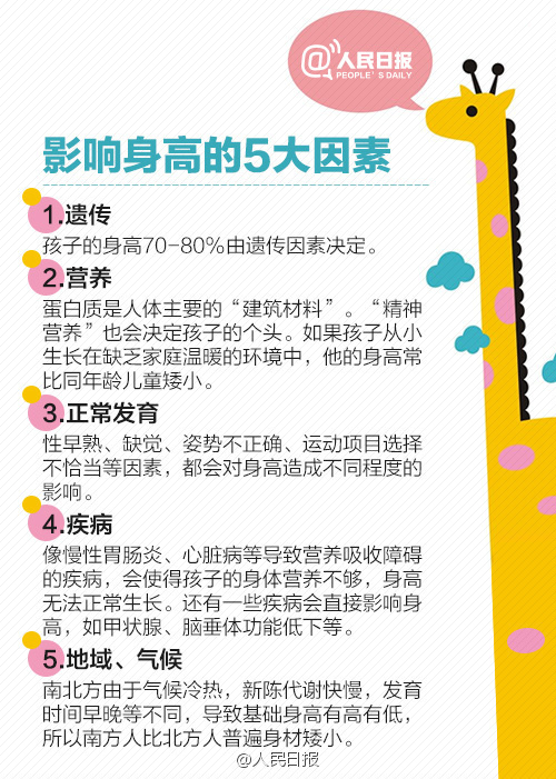 與此同時(shí),健康合理飲食、減少精神、心理壓力、多曬曬太陽(yáng)等,都能促進(jìn)身高增長(zhǎng)。父母高,孩子一定高?身高到底由誰(shuí)決定?其實(shí),孩子身高70-80%由遺傳因素決定,20%-30%受后天因素影響。后天做不好,真的會(huì)拖孩子后腿!春季是生長(zhǎng)發(fā)育期孩子的長(zhǎng)高旺季,多運(yùn)動(dòng)、正姿勢(shì)、補(bǔ)營(yíng)養(yǎng)、保睡眠...戳圖學(xué)習(xí)↓↓幫孩子抓住長(zhǎng)個(gè)黃金期!
