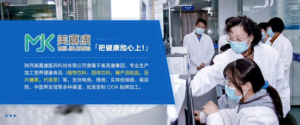 特膳食品/植物飲料/膏滋產(chǎn)品等大健康產(chǎn)品招商,嚴格控銷,嚴禁掛網(wǎng),文號齊全,可OEM貼牌代工! No.1企業(yè)簡介 陜西美嘉康醫(yī)藥科技有限公司專業(yè)生產(chǎn)加工特膳食品、功能食品(飲料,糖果制品,蜂產(chǎn)品、代用茶)等,支持電商、微商、實體經(jīng)銷商、美容院、中醫(yī)養(yǎng)生館等多種渠道,批發(fā)定制OEM貼牌加工。陜西美嘉康醫(yī)藥科技有限公司是一家專注營養(yǎng)健康食