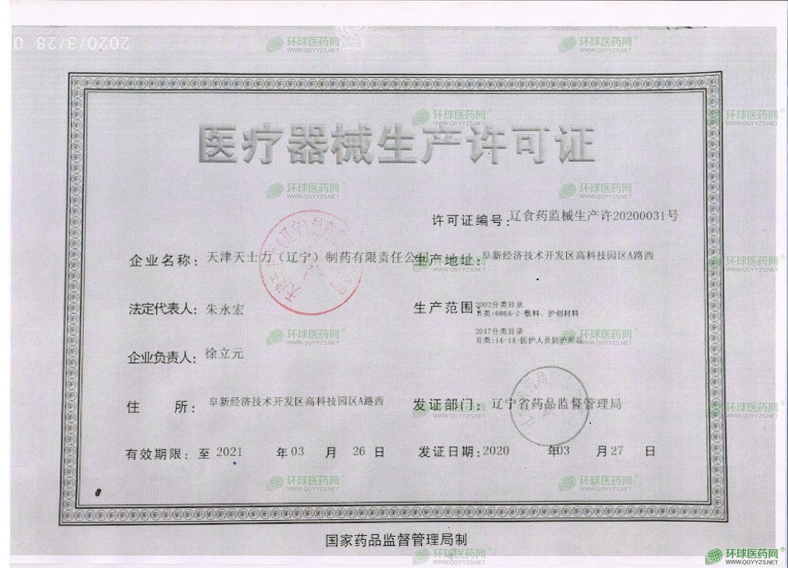 公司成立于2003年03月03日,注冊地位于阜新經(jīng)濟技術(shù)開發(fā)區(qū)高科技園A路西,法定代表人為朱永宏。經(jīng)營范圍包括生產(chǎn)片劑、顆粒劑、丸劑(蜜丸、水蜜丸、水丸、濃縮丸、糊丸)散劑、口服液及硬膠囊劑,生產(chǎn)、銷售醫(yī)療器械、保健品,糖果、巧克力及蜜餞制造、其他食品制造,貨物及技術(shù)進出口。(依法須經(jīng)批準的項目,經(jīng)相關(guān)部門批準后方可開展經(jīng)營活動。)