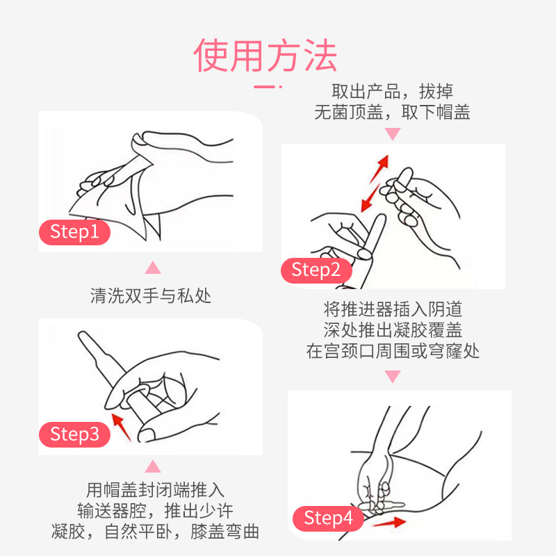 【使用方法】晚上睡前清洗外陰后,打開包裝、取出產(chǎn)品,拔掉無菌頂蓋、取下蓋帽,用蓋帽封閉端推入輸送器腔,推出少許凝膠,自然平臥位。膝蓋彎曲,將推進(jìn)器插入陰道深處推出凝膠覆蓋在宮頸口周圍或穹窿處,抽出輸送器棄之。1支/次,1次/日,嚴(yán)重者2支/日,早晚各一支或者遵醫(yī)囑。6支為一個療程,一般1到2個療程創(chuàng)面修復(fù)。