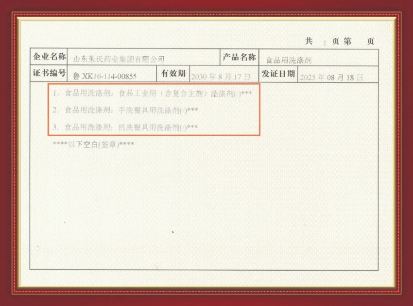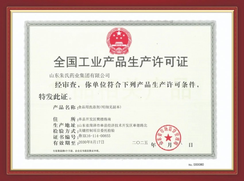 喜訊!山東朱氏藥業(yè)集團獲食品用洗滌劑生產(chǎn)許可證!